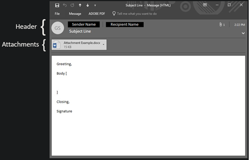 Before we can discuss protecting yourself it’s important to understand the basic email structure. Below is an image of your standard email (this is an example pulled from Outlook and may look different in other mail clients). Please not the header and all its parts, where to find attachments, and in the message itself the greeting, body, closing statement, and signature.